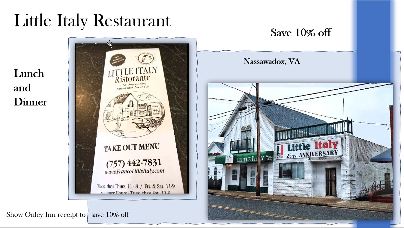 Lunch, Dinner, Bar - Onancock, VA (3.1 miles)
