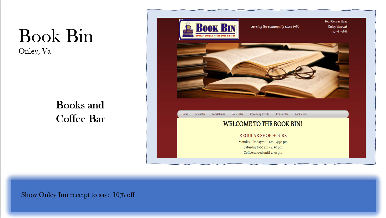Books and Coffee Bar – Onley, VA (0.01 miles)