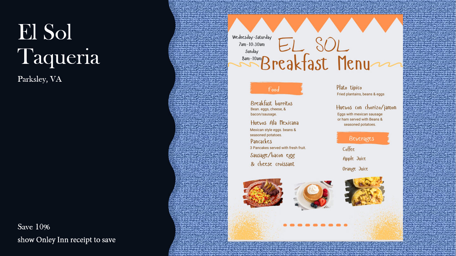 Lunch, Dinner – Onley VA (0.2 miles)